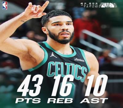 2024年12月22日,塔图姆面对公牛24中16,三分15中9,罚球2中2,爆砍43分15篮板10助攻
