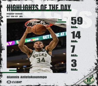 本赛季联盟最高分字母34中21&17罚16中爆砍59分14板7助2断3帽