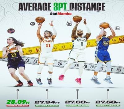 本赛季至今,克拉克命中的三分平均距离篮筐28.09英尺(约8.56米),比巅峰特雷-杨、利拉德以及库里的射程都要远!