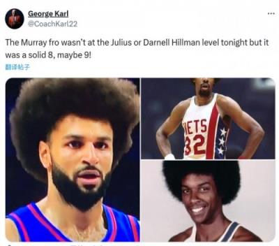 前掘金主帅乔治-卡尔对此点评道:“穆雷的爆炸头没有J博士或达内尔-希尔曼的帅,今天这个我打8分、9分也行。”