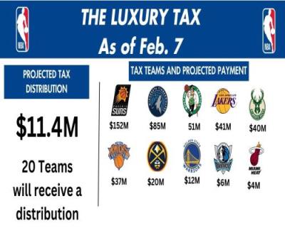 这样,奢侈税总额将约为4亿4800万美元,非奢侈税球队将均分其中的50%,因此无需缴纳奢侈税的20支球队每队分红约为1140万美元。