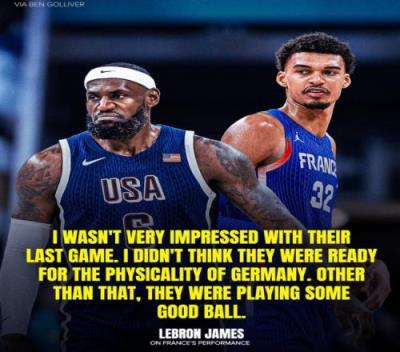 赛后,詹姆斯接受了记者采访。谈到法国上一场对阵德国(法国71-85不敌德国),他说道:“我对他们的上一场比赛印象不太好。我认为他们没有准备好面对德国的身体对抗。除此之外,他们也打出了一些好球。”