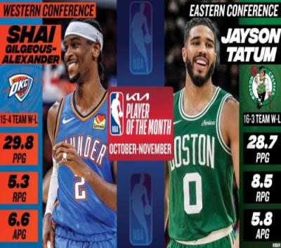 体育资讯12月4日报道宣称 今日NBA官方宣布,雷霆球星亚历山大和绿军球星塔图姆分别成为10-11月西部和东部月最佳球员。