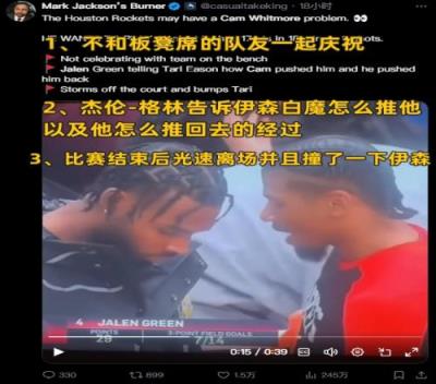 体育资讯01月09日报道宣称 美媒晒出了火箭击败奇才的比赛中,惠特摩尔一些沮丧的表现片段。