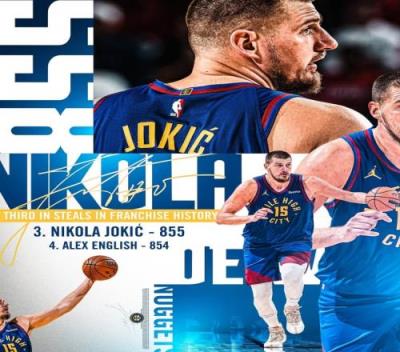 本场比赛过后,约基奇的队史抢断数来到856次(图中为比赛中2抢断时的数据),超越名宿英格利什,上升至掘金队史第三位。