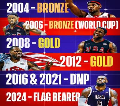 2024年巴黎奥运会,詹姆斯将担任美国代表团的旗手;