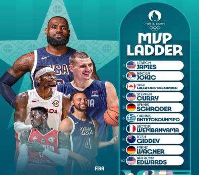 体育资讯7月25日报道宣称 今天,FIBA官网发布了巴黎奥运会男篮MVP榜,詹姆斯居首,约基奇和亚历山大分列二三位。