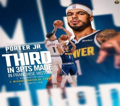 本场比赛过后,小波特的三分命中数来到769记,超越JR-史密斯,上升至掘金队史第三,仅次于贾马尔-穆雷(1074)和威尔-巴顿(804)。