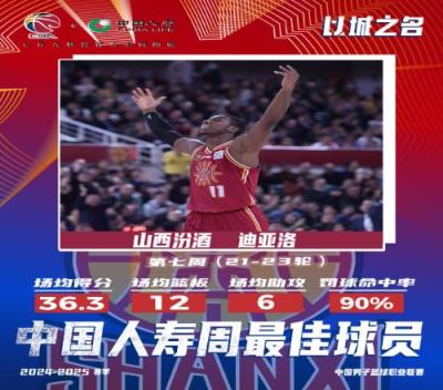 体育资讯12月29日报道宣称 CBA官方宣布,迪亚洛当选2024-2025赛季常规赛第七周最佳外援。