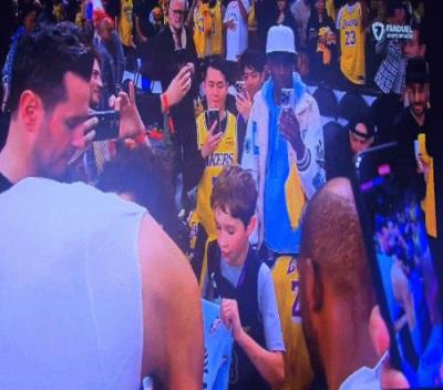 赛后文班亚马和保罗来到场边,为湖人主帅雷迪克的两个儿子签名并合影留念。