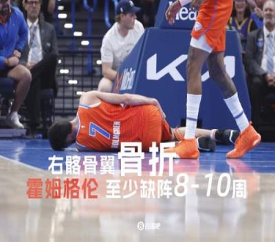 今天下午,雷霆官方宣布,霍姆格伦遭遇右髂骨翼骨折,预计可以在本赛季回归,他回归赛场的方案将在8-10周后更新。