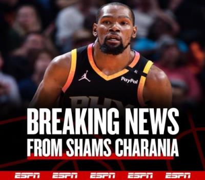 Shams:杜兰特左脚踝扭伤至少伤缺一周,一周内重新评估