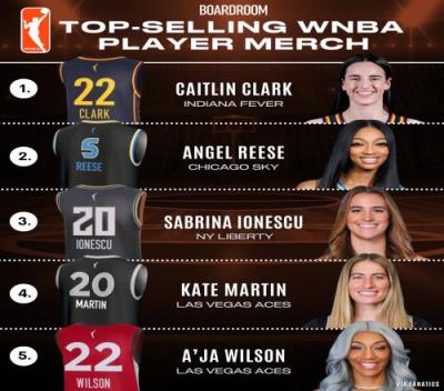 体育资讯08月22日报道宣 美媒Boardroom晒出了本赛季WNBA球衣销量榜前五,三位新秀在列,前二被新秀包揽。
