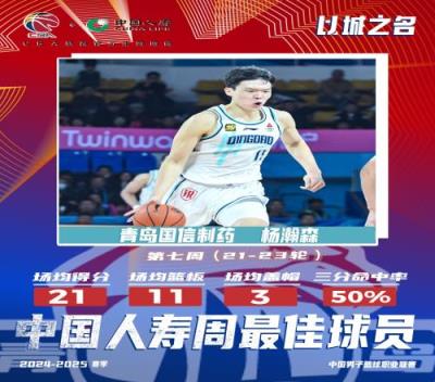 体育资讯12月29日报道宣称 CBA联赛官方宣布,青岛球员杨瀚森当选常规赛第七周周最佳球员。
