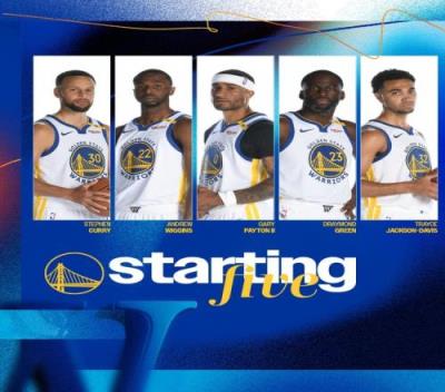 勇士赛前公布了本场比赛首发:库里、维金斯、佩顿二世、追梦、TJD。