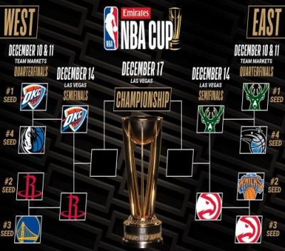 体育资讯12月12日报道宣称 NBA杯四强对阵确定,老鹰VS雄鹿,火箭VS雷霆。