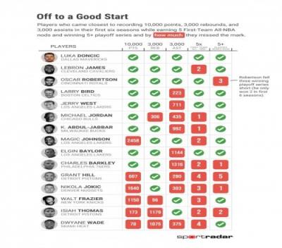 在生涯前6个赛季中,东契奇至少得到10000分、3000篮板、3000助攻,且5次入选年度最佳阵容一阵+赢下至少5个季后赛系列赛,是历史唯一。