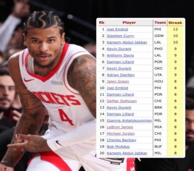 据统计,这是杰伦-格林连续第8场比赛至少砍下25+,且真实命中率达到60%。杰伦-格林是NBA历史上第13位达成这一成就的球员,且是最年轻的一位(达成时是22岁零345天)。