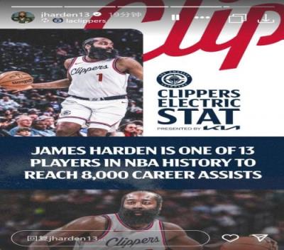 助攻达8000&历史第13人!哈登INS转发今日里程碑