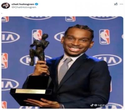 赛后,雷霆中锋霍姆格伦晒出了亚历山大拿着MVP奖杯的P图。