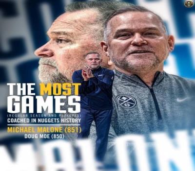 今天掘金官方更推显示,主帅迈克-马龙执教场数来到了851场(常规赛+季后赛),超越道格-莫(850场)升至掘金队史第一。