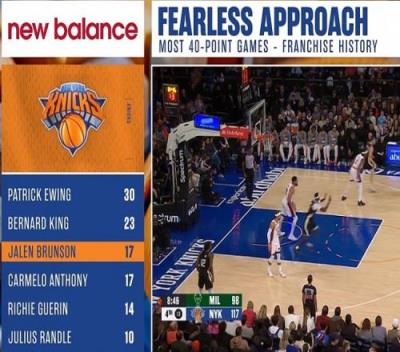 据统计,这是布伦森尼克斯生涯第17次砍下40+,与安东尼并列队史第3,仅次于帕特里克-尤因(30次)与伯纳德-金(23次)。
