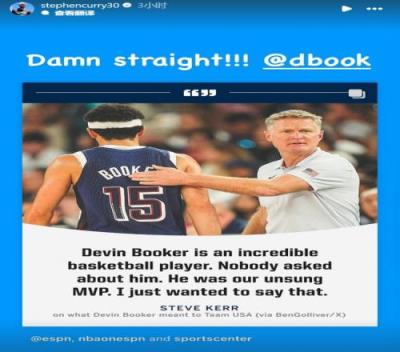 库里在INS转发了该言论,并写道:“毫无疑问,布克!”