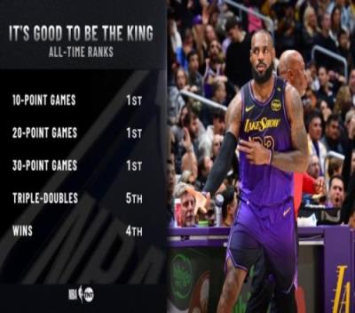 转播方晒詹姆斯成就:102030分场次数皆历史第1胜场数第4