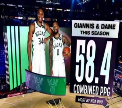赛前转播方晒出一组数据,字母哥和利拉德是本赛季联盟场均得分最多的二人组,两人合计砍下58.4分。