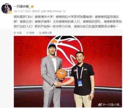 随后,温淞发文写道:“顺利圆梦CBA!感谢清华大学!感谢我的大学恩师陈磊指导!感谢首钢篮球俱乐部!感谢云总!感谢许指导!之后感谢我的家人们,感谢我的团队,感谢默默帮助我付出的人们!新的开始我一定会努力训练,继续为自己的篮球道路添光增彩~”