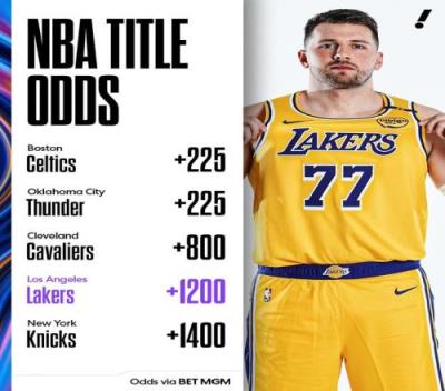 雅虎体育晒出最新的球队夺冠赔率,湖人在达成东契奇、马威的交易后,赔率从+4000来到+1200,升至联盟第四位!前五排行如下: