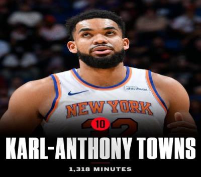 本赛季出场时间排行榜:大桥1592分钟领跑全联盟尼克斯5人进前10