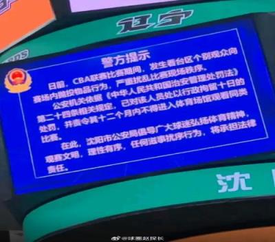 今天的比赛中,辽宁主场现场播报对该球迷的处罚,行政拘留十日,责令十二个月不得进入球馆观赛。