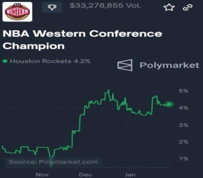知名预测市场平台Polymarket上显示,火箭本赛季夺得西部冠军的概率仅为4.2%。