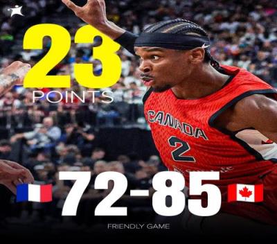 加拿大热身赛击败法国!SGA砍23+5+5巴雷特12罚10中文班10分7板