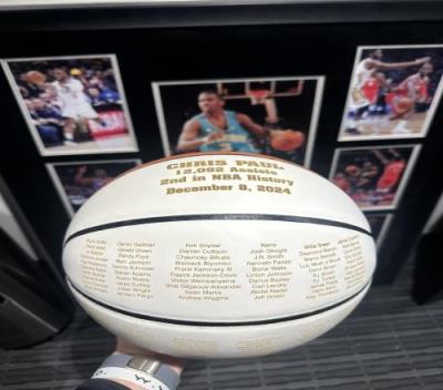 赛后,保罗收到了一个特殊的纪念球,上面有保罗助攻过的173个队友的名字,其中助攻次数最多的是格里芬(1157个)。