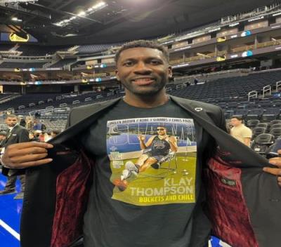 赛前,前勇士球员埃泽利来到现场,他身穿一件印有勇士时期克莱的T恤,为老东家和昔日队友加油。