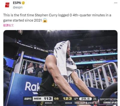 本场比赛,库里三节打卡,赛后ESPN发布错误内容:“这是库里自2021年以来第一次三节打卡。”