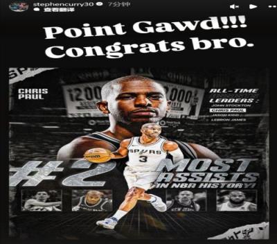 对此,勇士球星库里在INS送祝福,他写道:“控卫之神,祝贺兄弟。”