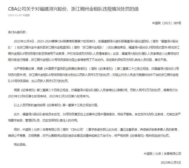 CBA发布处罚福建、浙江赛后冲突事件声明