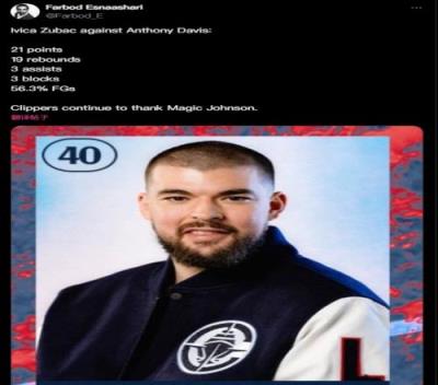 快船记者Farbod Esnaashari晒出祖巴茨今日的数据并配文:“快船还是得感恩魔术师约翰逊。”