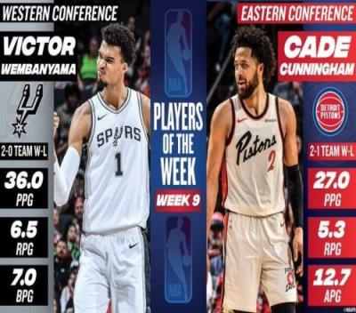 体育资讯12月24日报道宣称 NBA官方公布了第九周周最佳球员,西部文班亚马和东部康宁汉姆。