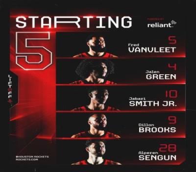 赛前火箭晒出了本场球队首发:范弗里特、杰伦-格林、小贾巴里-史密斯、狄龙、申京。