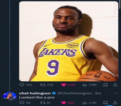 雷霆中锋霍姆格伦评论道:“(布朗尼的表现)现在看起来像职业球员了。”