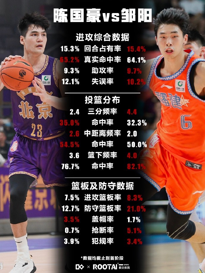 根据中国篮协技战术服务平台@普罗篮球公布的数据对比,陈国豪和邹阳之间的竞争异常激烈。从进攻综合、投篮分布、篮板与防守等相关数据来看,两位新秀在不同方面展现出各自的优势和特点。