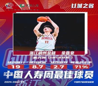 CBA官方原文如下:“余嘉豪当选2024-2025赛季CBA联赛常规赛第六周中国人寿周最佳球员,余嘉豪本周出战3场,带领浙江稠州篮球俱乐部取得了3胜0负的战绩,他场均出场31分钟的时间里能够得到19分、8.7篮板、2.7助攻,投篮命中率高达71%,同时3场比赛合计仅出现1次失误。在对阵北京控股的比赛中,余嘉豪更是8投全中,砍下20分7篮板3助攻,帮助球队在下半场逆转取胜。”