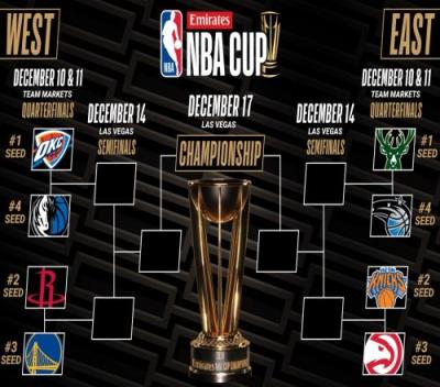 体育资讯12月04日报道宣称 NBA杯小组赛今日全部结束,淘汰赛八强对阵全部出炉。
