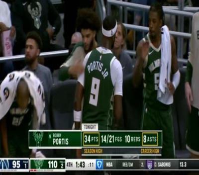 此役,雄鹿球员波蒂斯打出生涯高光一战。他出战31分44秒,21投14中(三分9中6),轰下赛季新高34分、生涯新高8次助攻,外加10篮板3抢断1盖帽,出现2次失误,正负值+6。