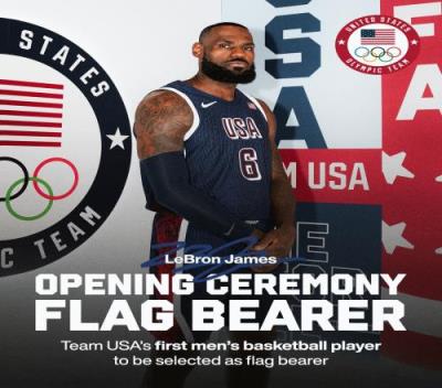 詹姆斯最终成为美国奥运代表团旗手,是美国奥运所有运动员一同投票得出。首次参加奥运会的斯蒂芬-库里也获得了本次美国奥运代表团旗手的提名。