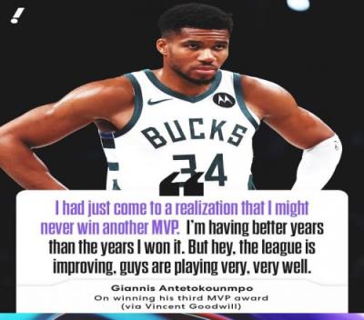 字母哥:联盟正在进步我意识到我可能再也拿不到MVP了